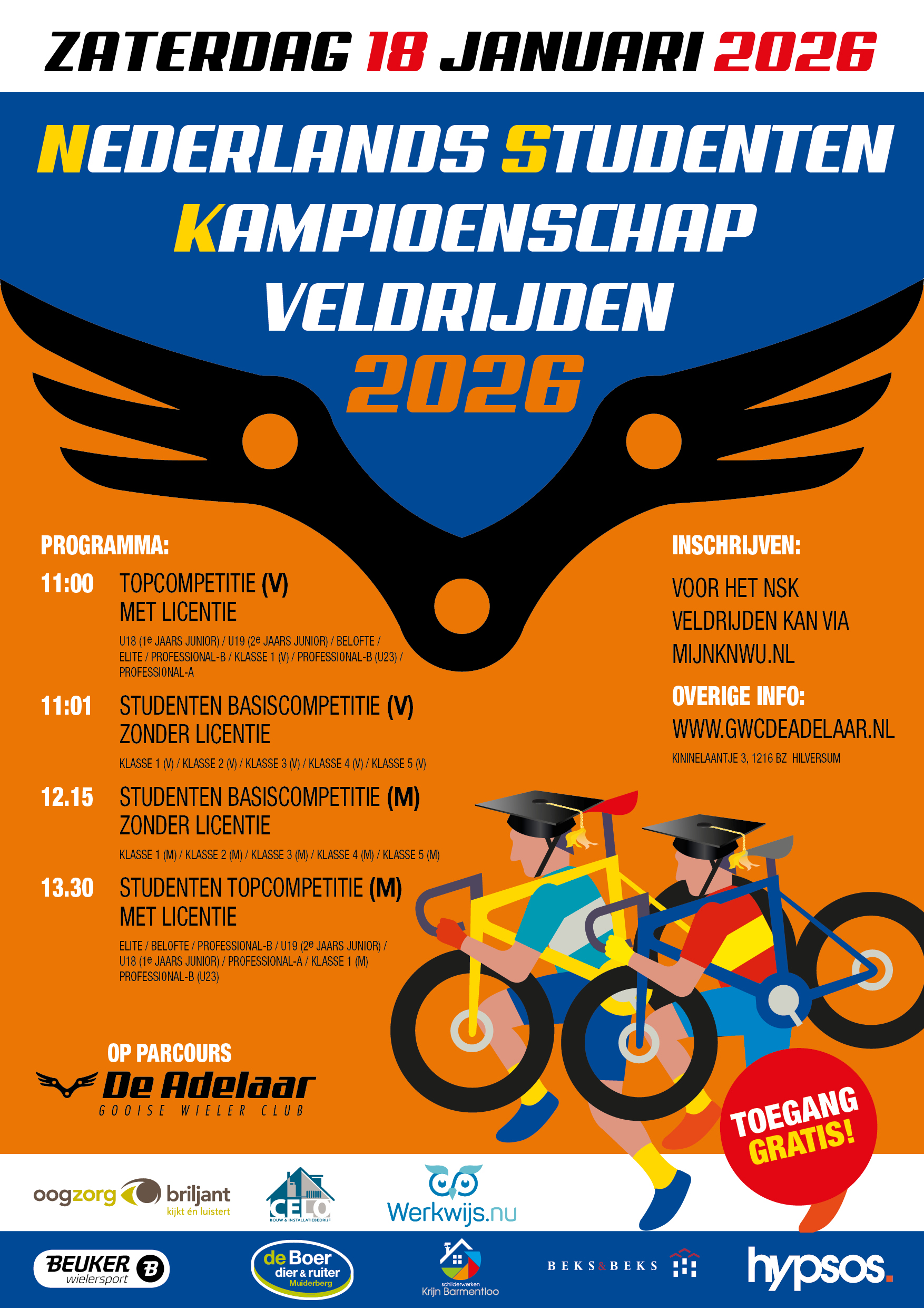 In samenwerking met USWV De Domrenner wordt op 18 januari 2026 het NSK 2026 verreden op ons eigen crossparcours. Renners met en renners zonder licentie kunnen kansmaken op de titel Nederlands Kampioen Veldrijden Studenten 2026.